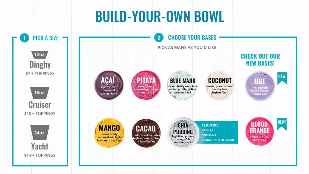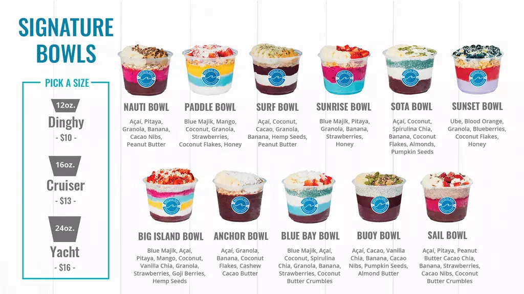 At Nautical Bowls, we combine healthy, fresh açaí and superfood smoothie bowls with an uplifting atmosphere to give you the energy to live a full life! Our bowls are natural, gluten-free, dairy-free, plant-based, and packed with superfoods, essential vitamins, and nutrients and come with a wide range of superfood toppings! Whether you're an athlete, a busy professional, or someone who simply loves delicious and nutritious food, our menu is designed to energize you. Refresh, refuel, and recharge with Nautical Bowls. Sail in to try our delicious superfood meals today! SUPER FOODS | SUPER MEAL | SUPER LIFE