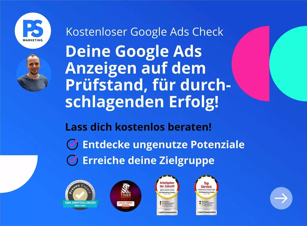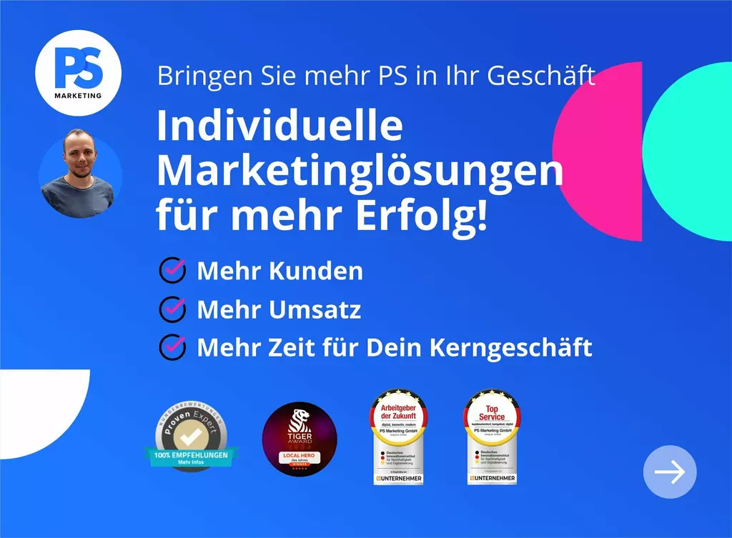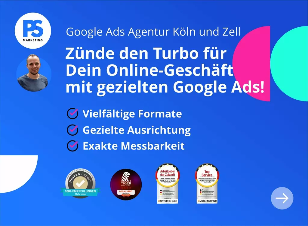 Online-Marketing ist unsere Spielwiese. Unser Ziel ist es mit unseren Kunden gemeinsam Erfolge zu feiern. Wir haben Spezialisten für die Bereiche: SEA (Google Ads), Webdesign, Native Ads und Social Media Ads. PS Marketing erstellt für Dich Deine persönliche und individuelle Strategie, damit wir den gemeinsamen Erfolg erzielen. Bei uns stehst Du im Mittelpunkt: Eine ehrliche und offene Beratung ist unser Versprechen, und ein fester Ansprechpartner Dein Navigator in der Welt des Online-Marketings. Wir glauben nicht an Vertragsbindungen unsere Leistung spricht für sich und hält unsere Kundenbindung stark. Top-Bewertungen und eine hohe Kundenzufriedenheit zeichnen uns aus. Von Köln bis Zell a.H wir sind da, wo Du uns brauchst.