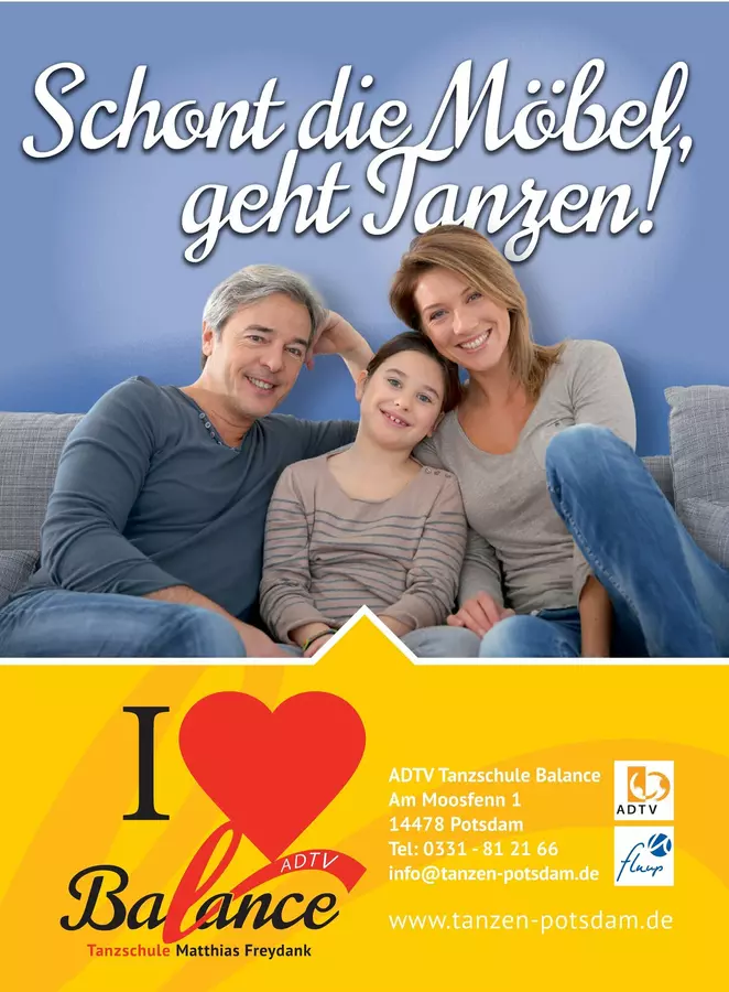 Schont die Möbel, kommt tanzen ;-) Die Anmeldung erfolgt immer nur zur unverbindlichen Probestunde! Wir sind stolz darauf, Teil des fluup Netzwerkes zu sein und heißen Euch herzlich Willkommen in der ADTV Tanzschule Balance. NEUE KURSE starten JEDEN Monat mit einer unverbindlichen Probestunde! Wir freuen uns auf Euch! Kostenlose Parkplätze für zwei Stunden findet Ihr auf dem Parkplatz vom Waldstadt-Center (Parkscheibe nicht vergessen!).