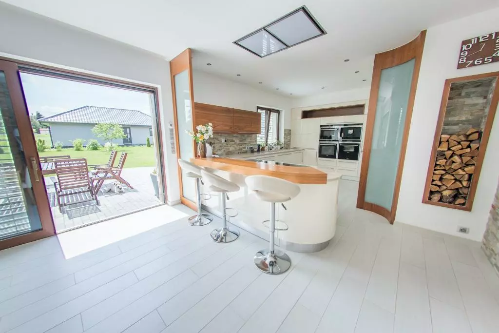 - Interiéry na míru – návrhy a realizace kompletního vybavení, od podlah až po nábytek.