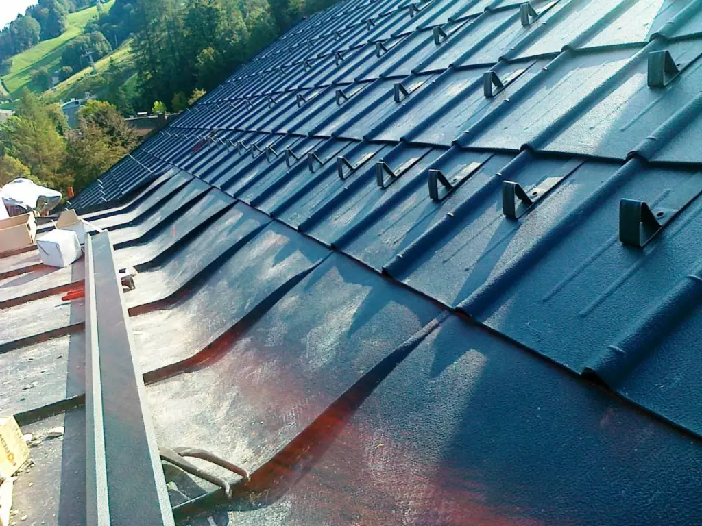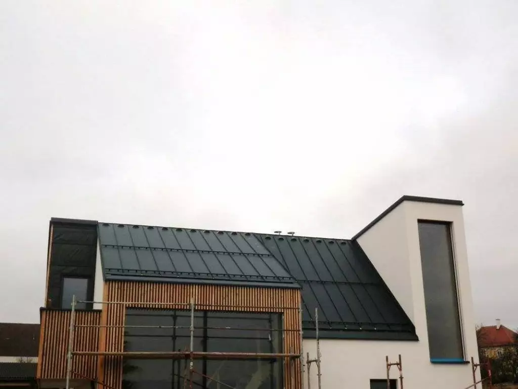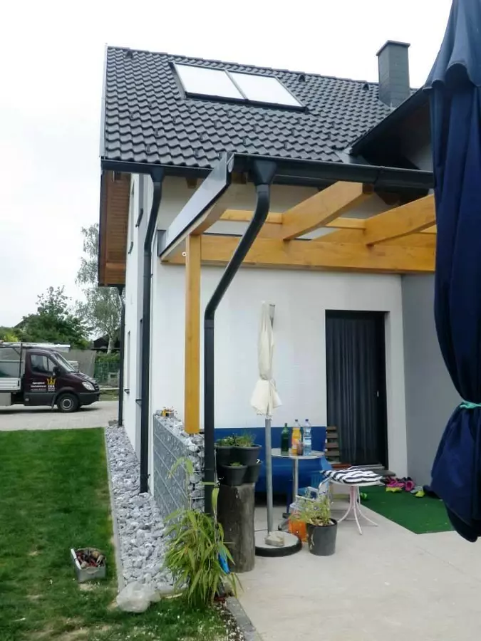 Prefa Dach, Trapezblechdeckung, Regenrinnen und Ablauf, Ortgangverblechungen, Giebelblech,
