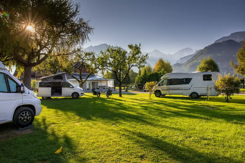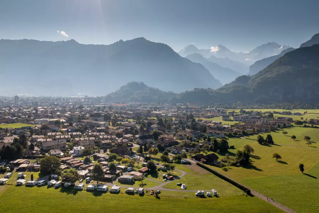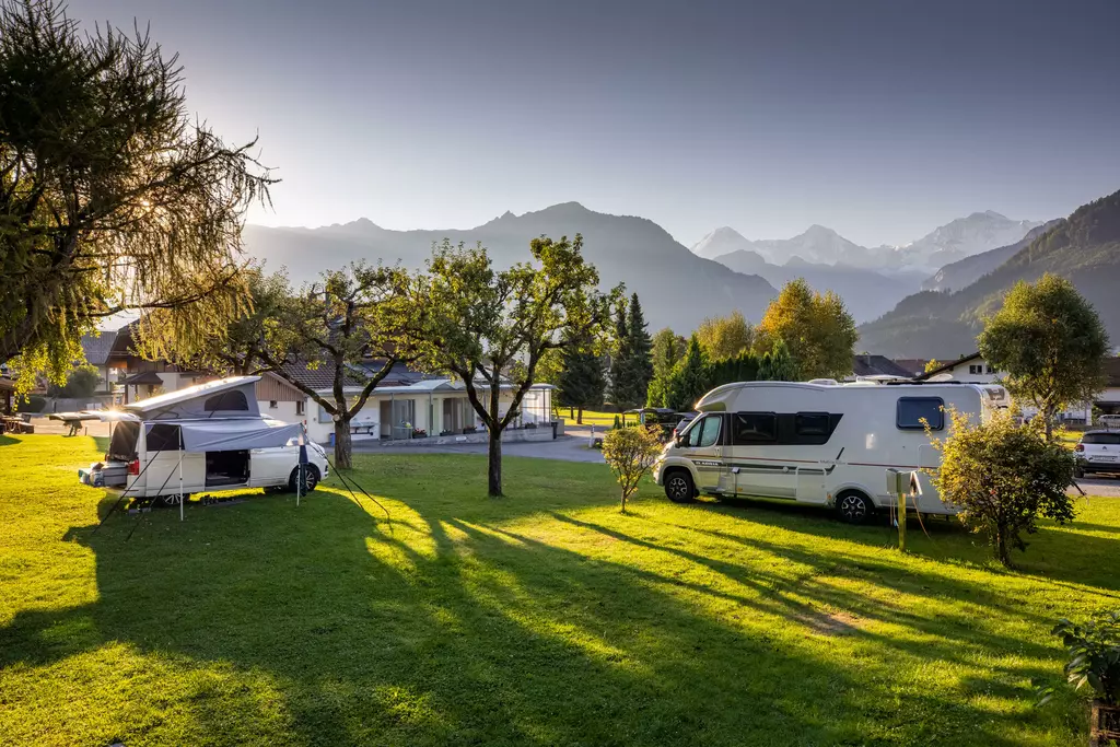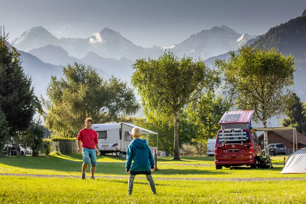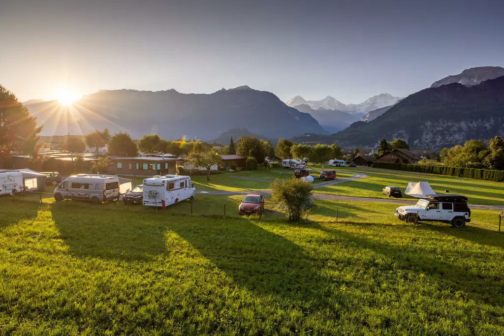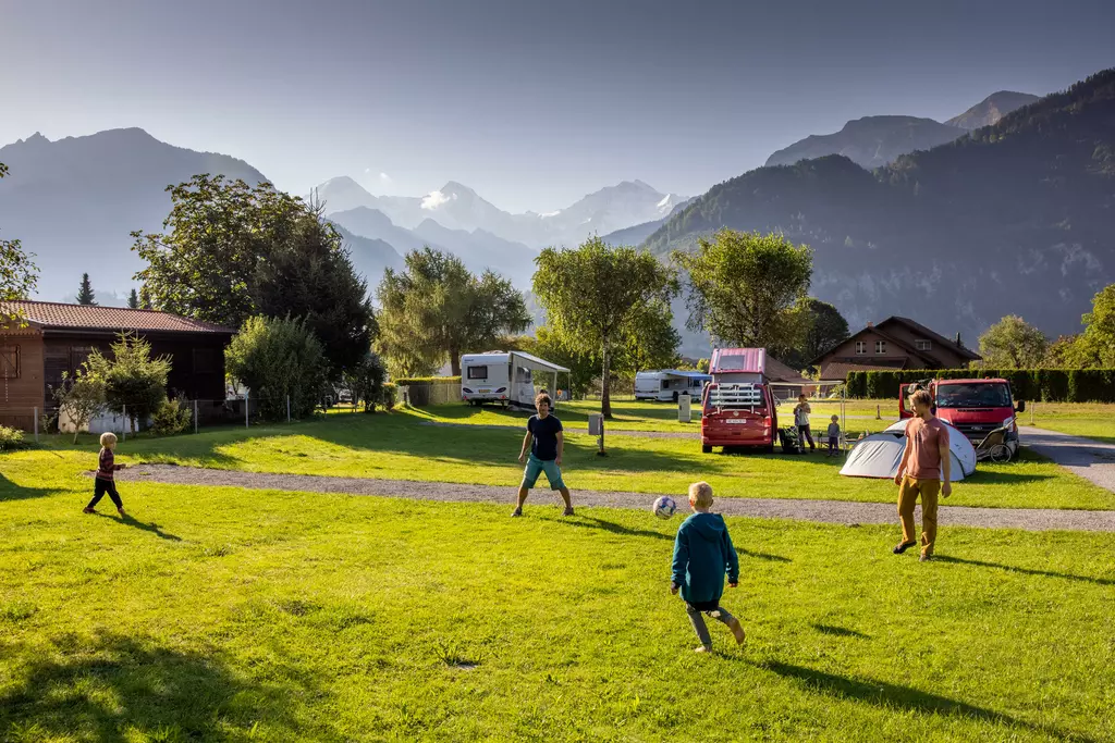 Jungfrau Camping - Planen Sie Ihre Ferien vor dem schönsten Bergpanorama Europas, beim Jungfraucamp in Interlaken. Wir sind ein ruhig gelegener Camping-Platz mit Blick auf Eiger, Mönch und Jungfrau. Erleben Sie Ferien im Zentrum des Berner Oberlands. Geniessen Sie Ihre Ferien mit traumhafter Aussicht auf Eiger, Mönch und Jungfrau. Der ideale Ort zur Erholung für die ganze Familie. Der Campingplatz liegt direkt neben einer Bushaltestelle und ist nur 20 Gehminuten vom Zentrum entfernt. Wir bieten auf ungefähr 2.4 Hektar Gesamtfläche über 100 Stellplätze für Wohnmobile, Caravans und Zelte. Für den nötigen Komfort stehen Ihnen unsere Standplätze wahlweise mit Strom (16 Amp.) und Wasseranschluss zur Verfügung. Alle Stellplätze sind parzelliert und können nach Ihren Wünschen reserviert werden. Nicht nur die gelungene Platzaufteilung macht den Jungfraucamp zu einer Wohlfühloase, bei heissen Tagen sorgen auch unsere Pools für angenehme Abkühlung und laden zum gemütlichen Verweilen ein. Zu den zeitgerechten Sanitäranlagen, bietet der Camping auch einen kleinen Lebensmittelladen, welcher mit seiner vielseitigen Auswahl das Gesamtangebot harmonisch abrundet. Der ideale Ort zur Erholung für die ganze Familie im Herzen vom Berner Oberland. Ihre Gastgeber Carole Werthmüller & Sascha Bieri freuen sich auf Sie.