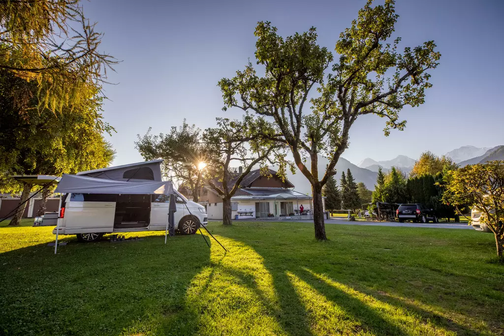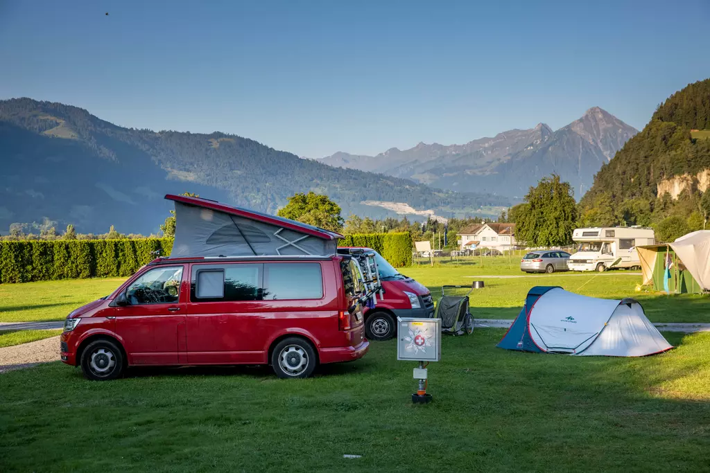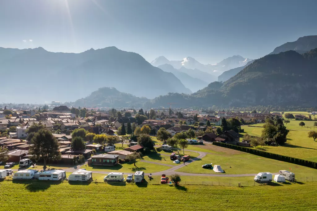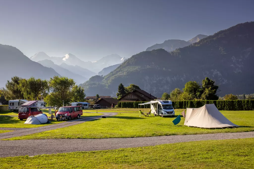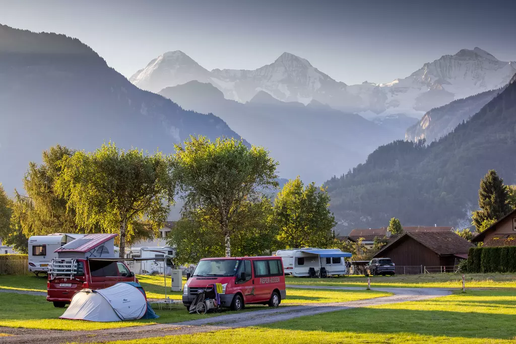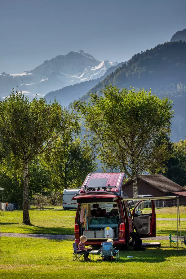 Jungfrau Camping - Planen Sie Ihre Ferien vor dem schönsten Bergpanorama Europas, beim Jungfraucamp in Interlaken. Wir sind ein ruhig gelegener Camping-Platz mit Blick auf Eiger, Mönch und Jungfrau. Erleben Sie Ferien im Zentrum des Berner Oberlands. Geniessen Sie Ihre Ferien mit traumhafter Aussicht auf Eiger, Mönch und Jungfrau. Der ideale Ort zur Erholung für die ganze Familie. Der Campingplatz liegt direkt neben einer Bushaltestelle und ist nur 20 Gehminuten vom Zentrum entfernt. Wir bieten auf ungefähr 2.4 Hektar Gesamtfläche über 100 Stellplätze für Wohnmobile, Caravans und Zelte. Für den nötigen Komfort stehen Ihnen unsere Standplätze wahlweise mit Strom (16 Amp.) und Wasseranschluss zur Verfügung. Alle Stellplätze sind parzelliert und können nach Ihren Wünschen reserviert werden. Nicht nur die gelungene Platzaufteilung macht den Jungfraucamp zu einer Wohlfühloase, bei heissen Tagen sorgen auch unsere Pools für angenehme Abkühlung und laden zum gemütlichen Verweilen ein. Zu den zeitgerechten Sanitäranlagen, bietet der Camping auch einen kleinen Lebensmittelladen, welcher mit seiner vielseitigen Auswahl das Gesamtangebot harmonisch abrundet. Der ideale Ort zur Erholung für die ganze Familie im Herzen vom Berner Oberland. Ihre Gastgeber Carole Werthmüller & Sascha Bieri freuen sich auf Sie.